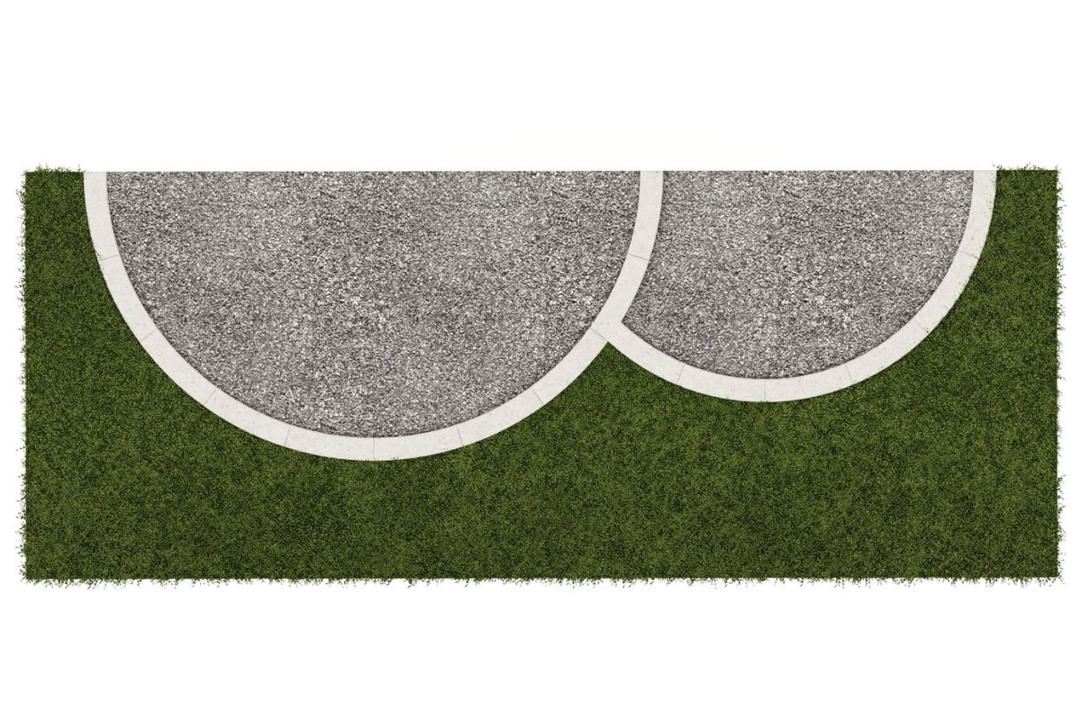 Estetyczna i funkcjonalna aranżacja rabaty z wykorzystaniem betonowych obrzeży łukowych, które tworzą efektowną, podwójną kompozycję okręgu. Gotowy zestaw elementów o różnych promieniach umożliwia szybki montaż i uporządkowanie przestrzeni bez konieczności docinania ani dopasowywania na miejscu.
