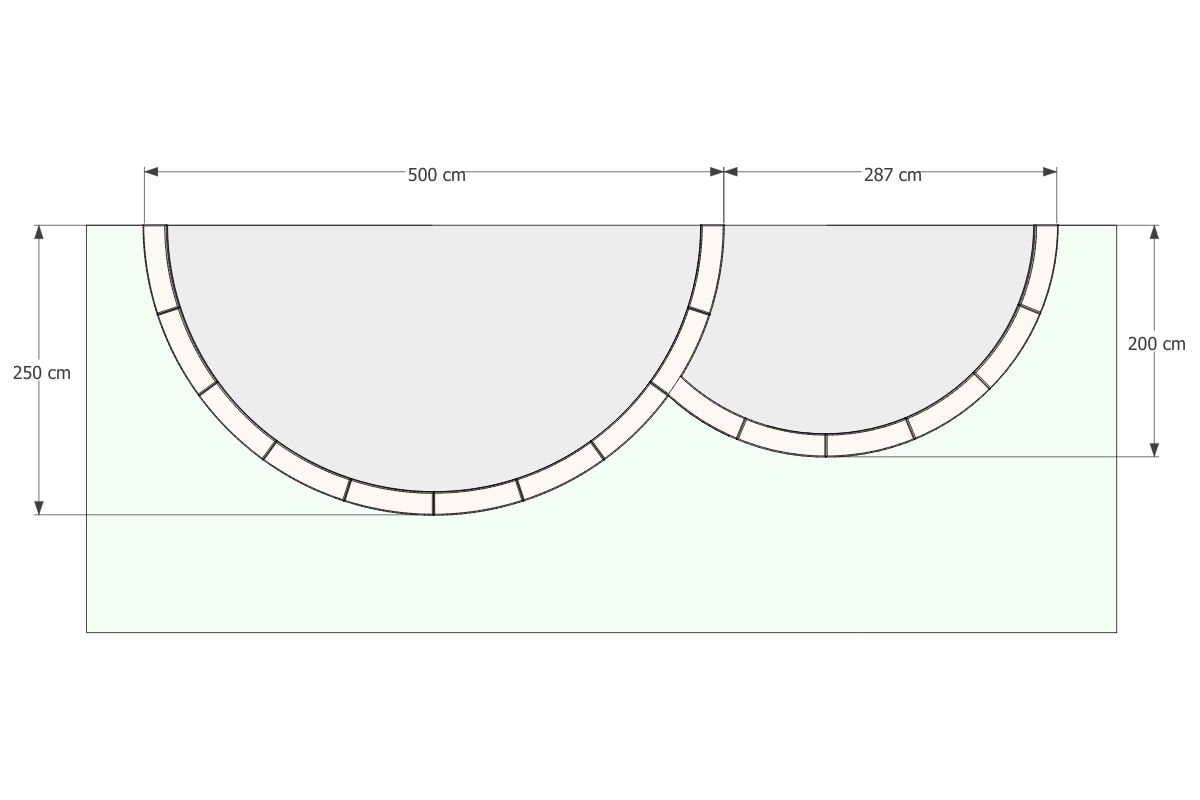 Estetyczny zestaw obrzeży łukowych betonowych do aranżacji o wymiarach 627 × 145 cm. Gotowa forma łuku z elementów o średnicach: 2m i 5m. Wymaga dwóch prostych docinek przy montażu.