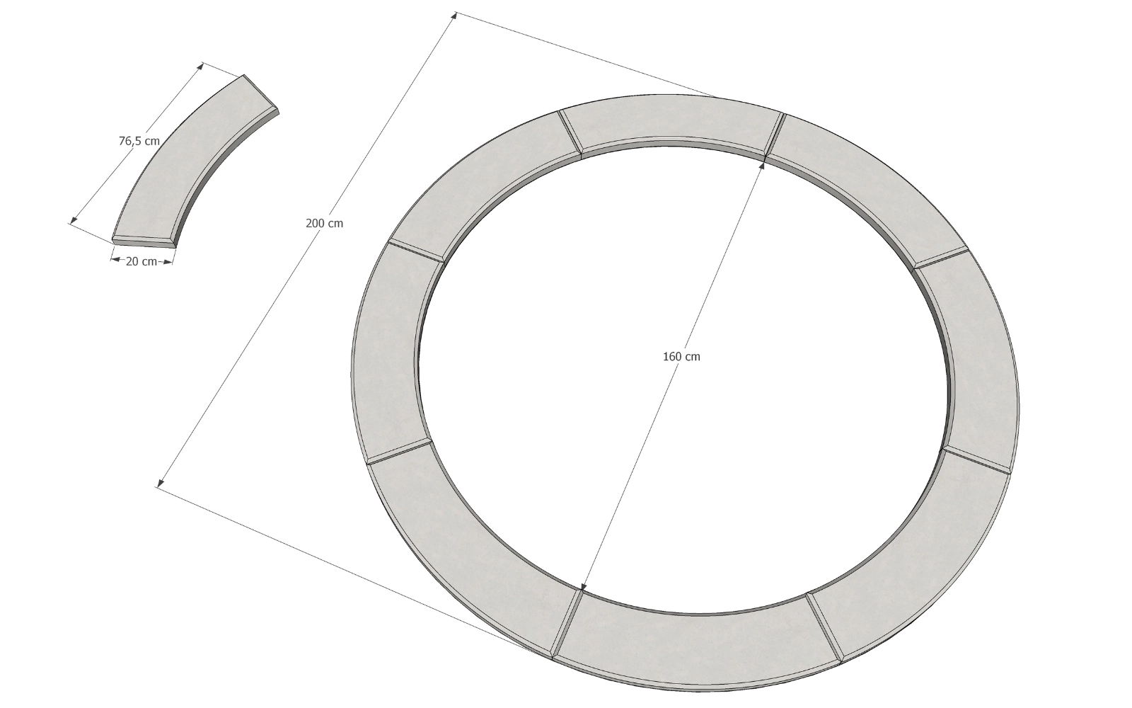 Obrzeże składa się z 8 elementów, które po połączeniu tworzą pełny, stabilny okrąg o średnicy 2 m. Montaż nie wymaga użycia specjalistycznych narzędzi – elementy dopasowują się do siebie bez problemu, tworząc spójną i trwałą całość.