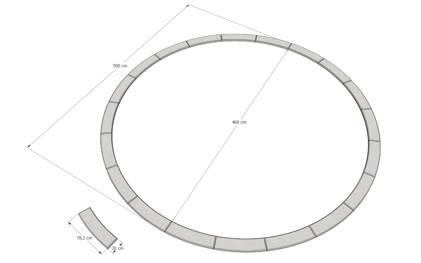 Każdy wariant obrzeża dostępny w naszej ofercie ma podaną średnicę gotowego koła (np. 1 m, 2 m, 3 m itd.) oraz informację, że komplet składa się z odpowiedniej liczby elementów tworzących pełne koło.