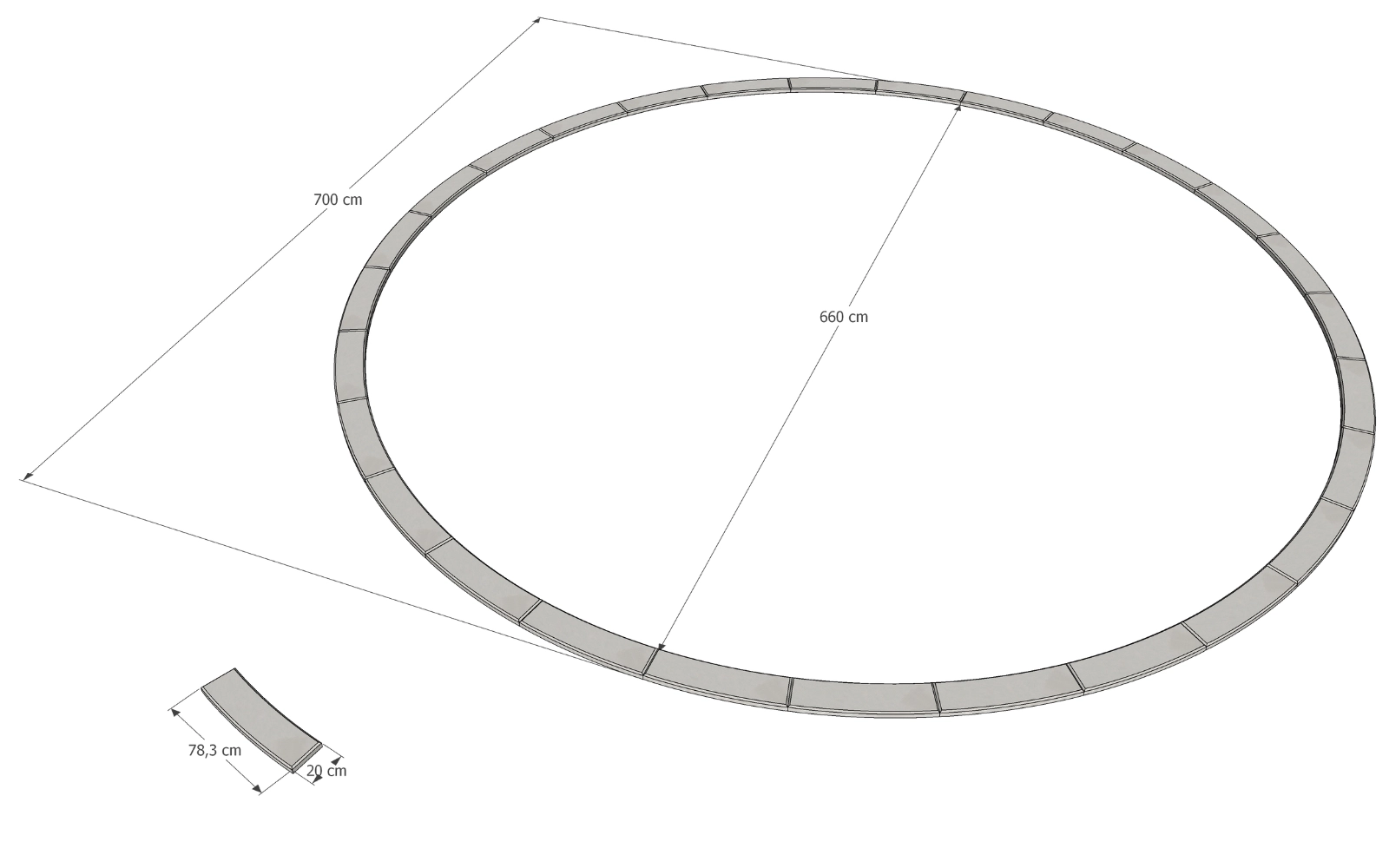 Każdy wariant obrzeża dostępny w naszej ofercie ma podaną średnicę gotowego koła (np. 1 m, 2 m, 3 m itd.) oraz informację, że komplet składa się z odpowiedniej liczby elementów tworzących pełne koło.