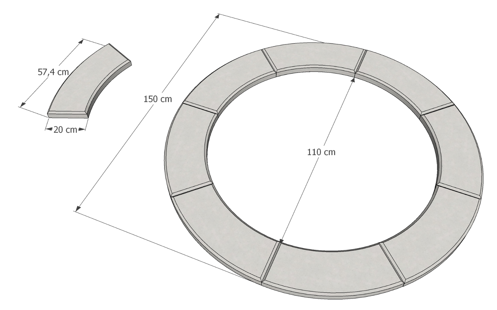 Każdy wariant obrzeża dostępny w naszej ofercie ma podaną średnicę gotowego koła (np. 1 m, 2 m, 3 m itd.) oraz informację, że komplet składa się z odpowiedniej liczby elementów tworzących pełne koło.